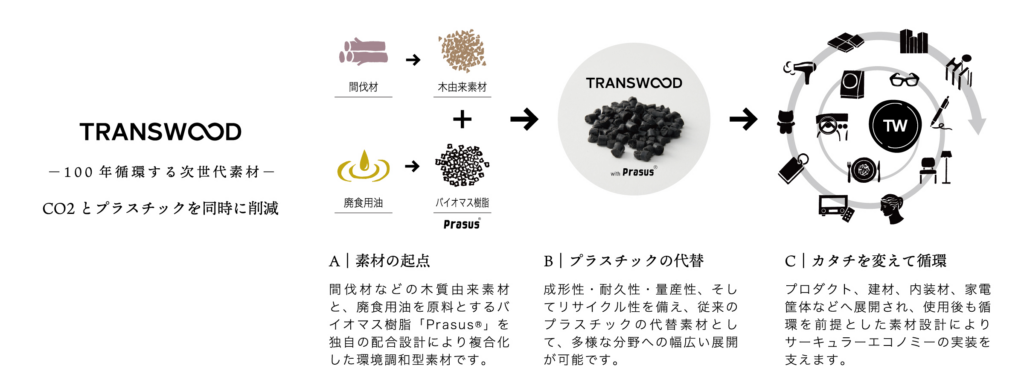当社が展開する環境調和型素材ブランド「TRANSWOOD®」は、「100年循環」をコンセプトに開発された素材です。間伐材などの木由来原料と、廃食用油由来のバイオマス樹脂を独自に配合し、製品ライフサイクル全体におけるCO₂排出量およびプラスチック使用量の削減に寄与します。